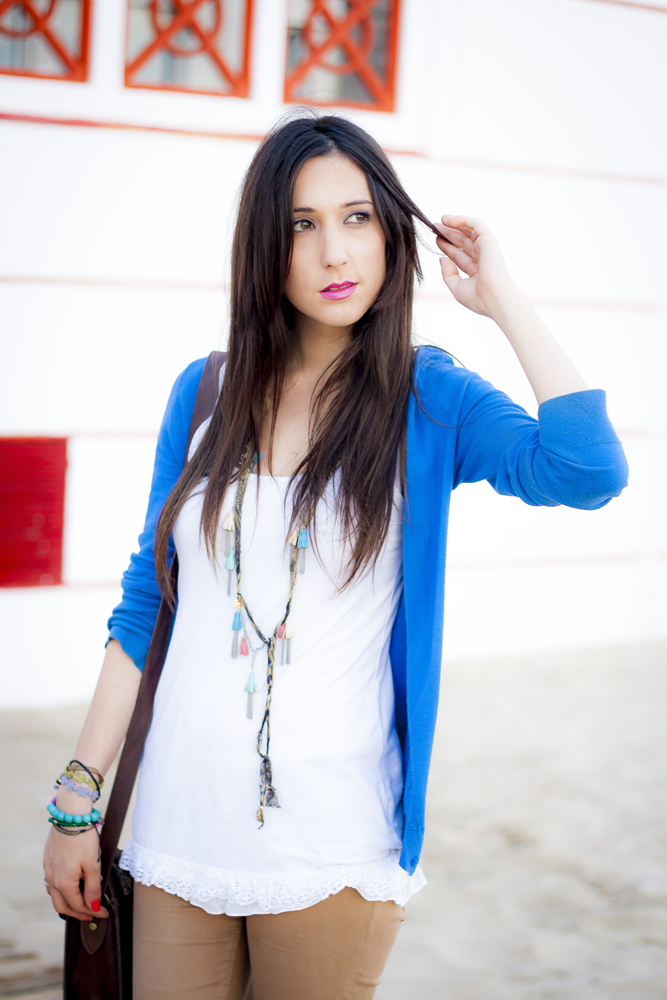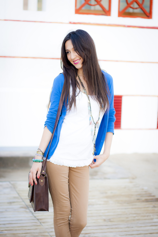 Como sabéis me encanta combinar prendas básica, funcionales que valen para cualquier momento del día o de la noche y aportan elegancia y estilo a nuestro día a día. Para esta ocasión mezclé el blanco y el camel con el azul klein y divertidos accesorios.